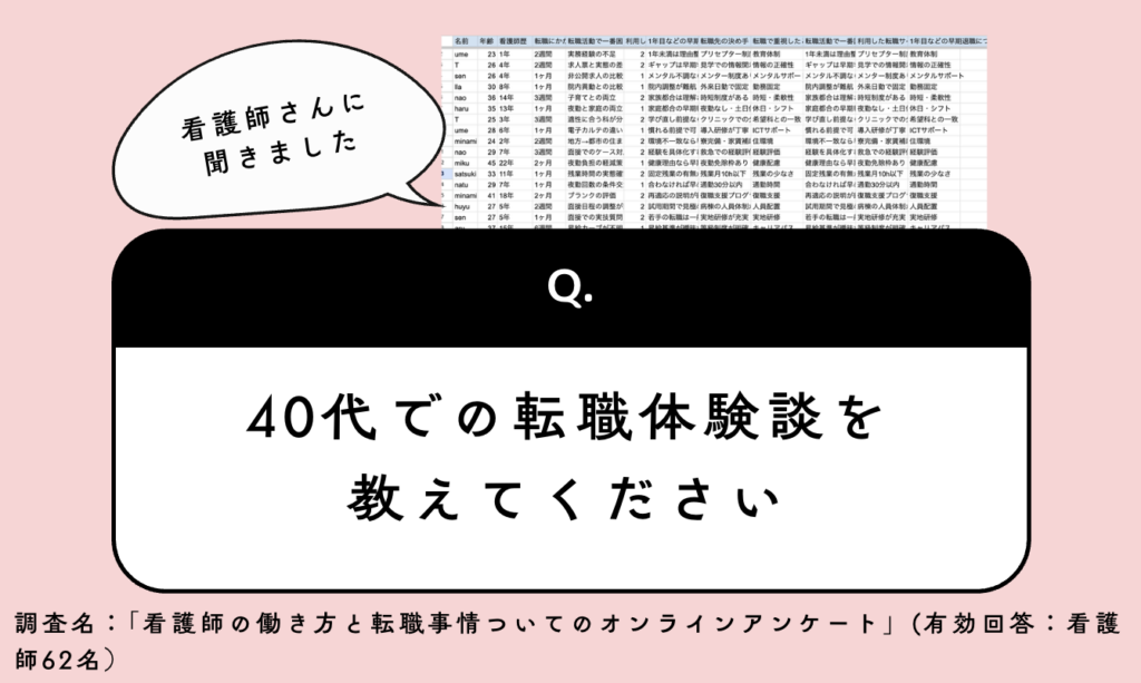 転職を考えたときまず最初に転職サイトで情報収集しました。その時に「40代活躍中」の求人が想像以上に多くて驚いた記憶があります。ブランクOKのところも多く、看護師は仕事に困らないというのは本当だなと実感しました。どうせいつかは転職するなら、準備は早い方が良いと思います。