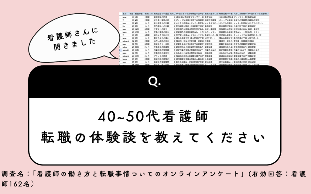 ずっと【看護師 求人 〇〇(地名)】と検索してて全然いいところが見つからなかったんですが、40~50代向けの会員登録制の看護師転職サイトに変えたら条件にピッタリ合うところが見つかりました。
