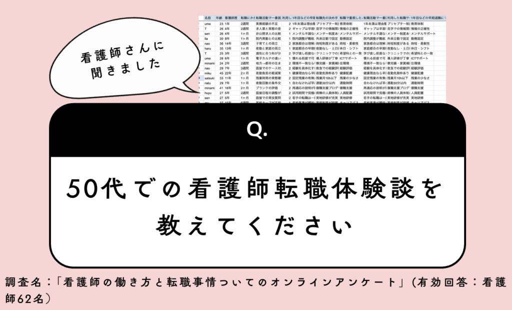 今の職場は50代向け看護師転職サイトに登録して見つけました。サイトによっては50代歓迎求人やパート求人をほとんど扱ってないところもあったので、どこで探すかは重要だと思います。