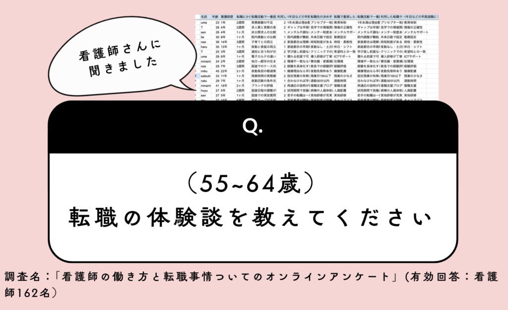 50代後半に入ったタイミングで転職しました。今は循環器内科・総合内科・血液内科の混合病棟にて勤務しています。前の職場が人手不足の影響でかなりハードだったため、今は無理なく働けてます。やっぱり環境(特に人手不足な職場かどうか)は重要ですね。