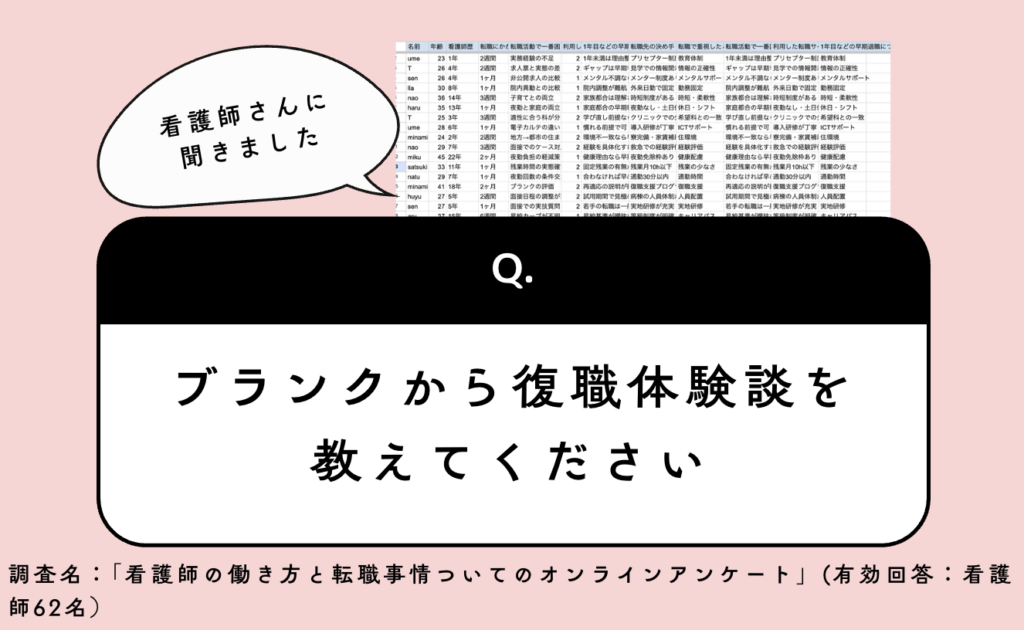 今の職場は復職向け看護師求人サイトに登録して見つけました。サイトによってはブランクOKの求人が全然なかったので、どこで探すかはかなり重要だと思います。